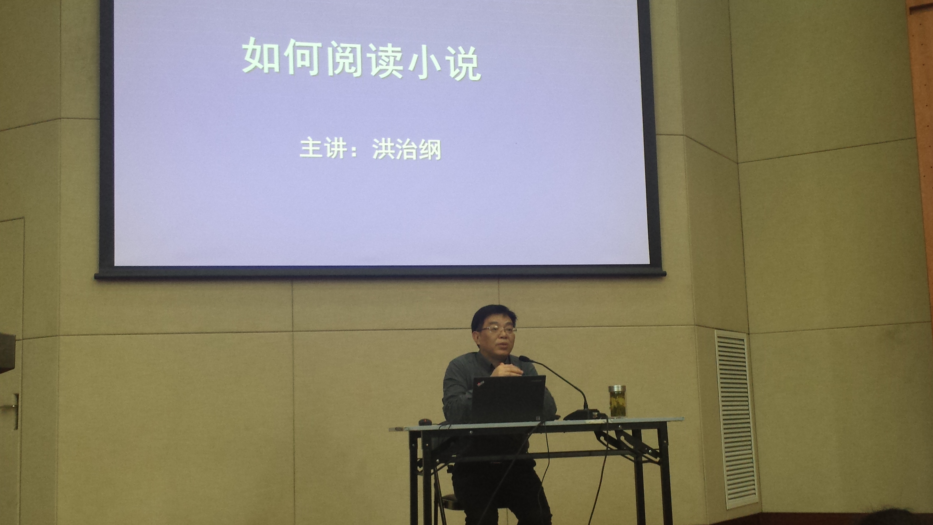 洪老师主要从“小说家”“说服力”“轻与重”和“敏感与准确”四个关键词向同学们讲述“如何阅读小说”。他说小说家就是一个编故事的工匠,编故事就像庖丁解牛应“进乎技矣”,读小说应注意人物、时间与空间、情节与细节、开头和结尾。看一个小说家是否优秀,首先应看他对各种故事元素的处理即叙事的潜能。