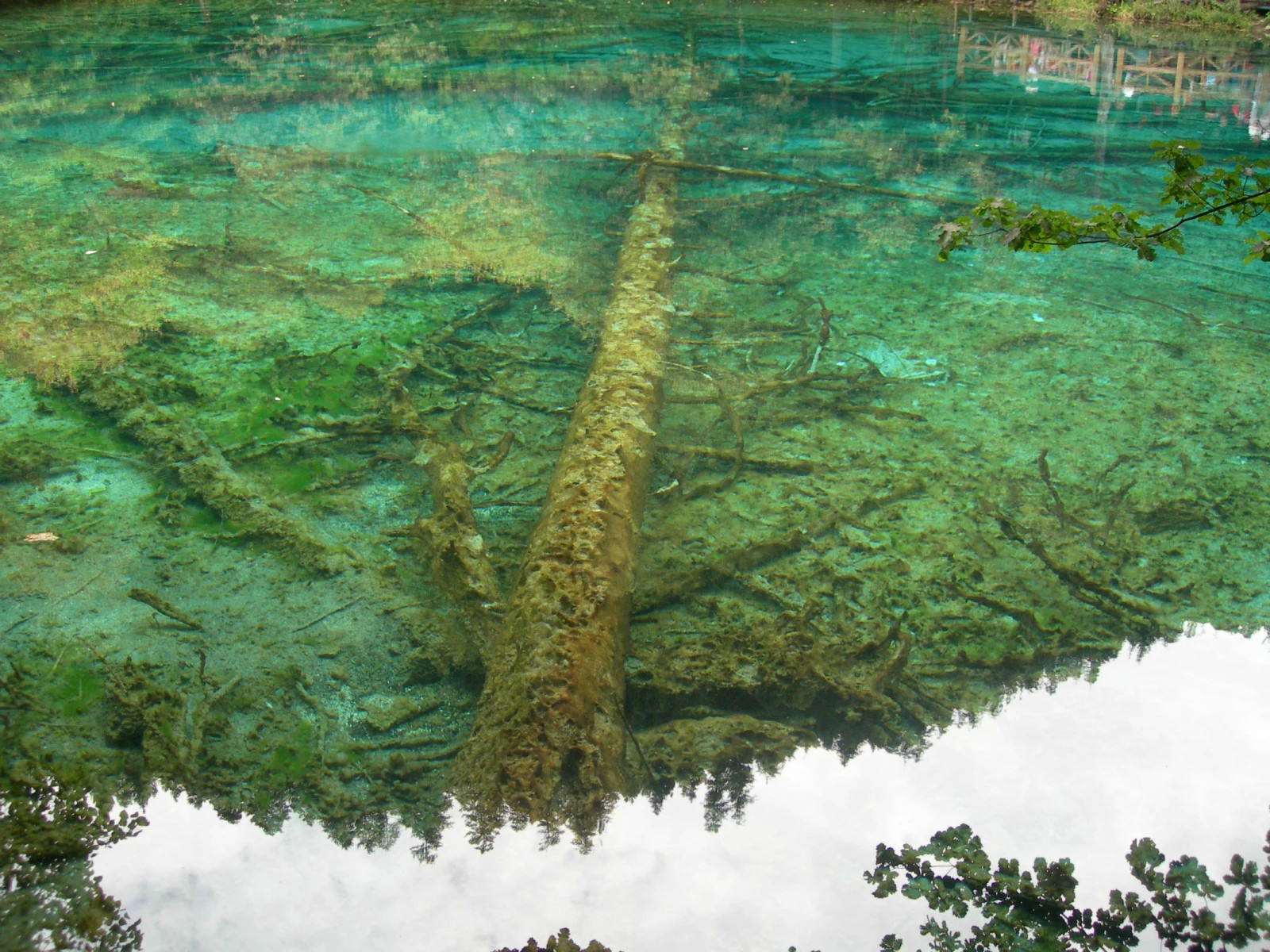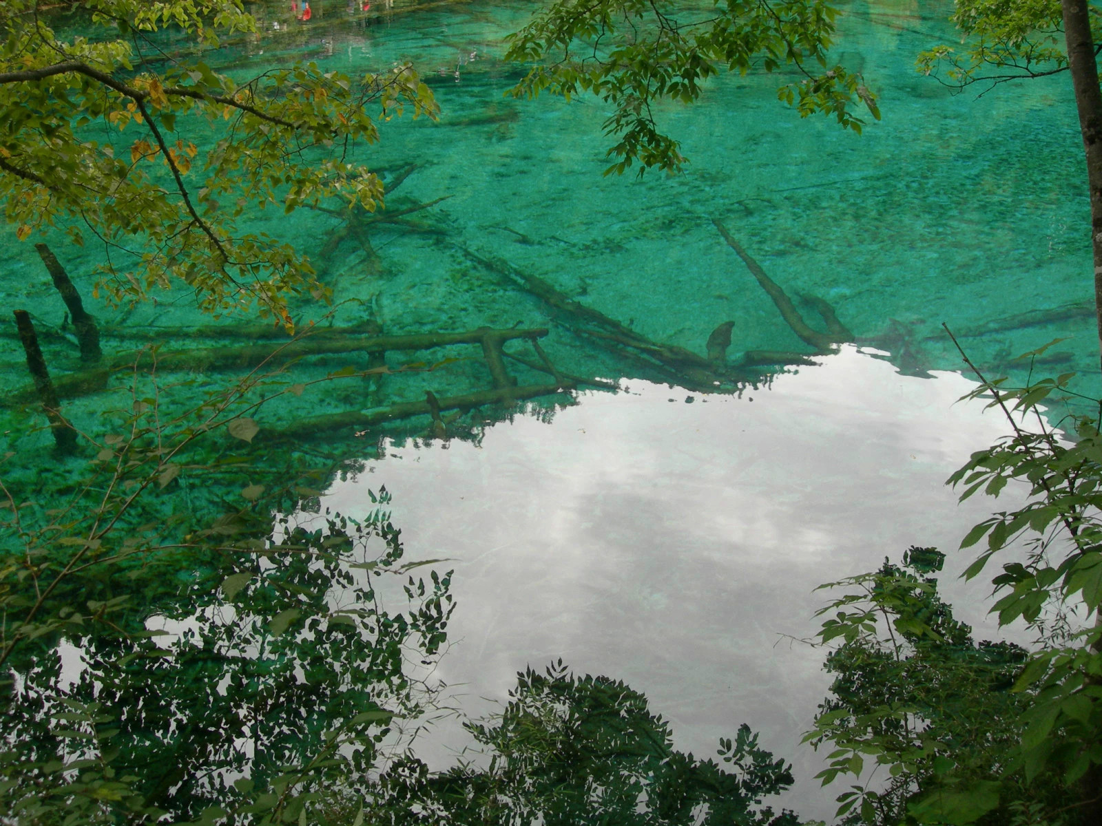 九寨沟的每一个海子都是人间仙境,各有各的特性,各有各惹人喜爱的地方,充满了诗意,让人百看不厌。九寨沟的海子美,美得让人如置画中,流连忘返,令人难以相信。她是那么地清,纤尘不染,一米、两米、十几米乃至几十米深的水清澈见底;又是那么地绿,晶莹剔透,像丝绸一样光滑柔顺,让人不忍触摸;还是那么地静,像一片硕大的天然宝镜,镶嵌在青山绿树中间,将满山的风景尽收其中,让你丝毫感觉不到水在流动。清风徐来,如镜的水面顿时微波荡漾,阳光下,波光粼粼,如同跳跃的小火花,有种让人忘却自己身在何处的感觉。感叹大自然居然有如此杰作,造就出这样绝色的水来。海子的水,有着与众不同的颜色,蓝得仿佛平铺着蓝宝石,晃动着天上漂浮的白云,荡漾着山间茂盛的树林,裹挟着林间悦耳的鸟鸣,倒映着雄鹰飞翔的英姿,盛载着藏民神圣的祝福,在平静的水面上轻柔地滑过,通向前方的幽谷,让人情不自禁地产生一缕缕无限的遐思。于是,水中狭长的溪鱼仿佛通人心似的,也轻歌曼舞起来,摆动起俊俏的尾巴,在水面悠然穿梭嬉戏,神秘地张望,轻快地在水底的古树藤蔓间游弋,尽情地舞蹈,为山泉增光添色,乐此不疲。恍惚中,你的眼前交叠着空中游动着鱼、水中飞翔着鸟的动人画卷。那明净的水,波澜不惊,透明得如同一面镜子,纯净得没有一点杂质。这里的水,是云贵高原雪山中流动的清泉,无论水多深,你都可以看透沉寂在水中的一草一木。那种清澈,是少女的眼睛,没有被任何邪念侵蚀过。静静地躺在海子里,水是神秘的天蓝色,静谧的碧绿色。蓝得天水一色,让你分不出哪是天,哪是水;那绿,连玛瑙也会在她的面前黯然失色。这些蓝和绿,哪怕高超的画家恐怕也难以调出,就像具有幽深富有内涵的女子,娴静地舒展着自己的身姿,尽情地敞开一身的胴体,怎么也瞧不够。流连其间,心灵自然而然得到了净化,浮躁之心烟消云散,亦如她一样的清澈明洁。我好多次想弯下身子和九寨沟的水亲吻一下,但看到没有一个人这样做,自己也终于作罢,甚至回来后还有些后悔,后悔自己当时的一丝杂念,玷污了她的圣洁。这就是九寨沟的魅力。她的纯洁无瑕,感染着每一个到过九寨沟的游客。近处绿水,清澈见底;远方蔚蓝,平静无波;两岸山树,映入海中。以绿为主调的色彩和周围宁静的环境,使游人恍如踏入仙境。因该地森林多,地层是石灰岩,含大量碳酸,对水起净化作用,所以水的透明度有的达30米。透过清亮的水,湖底的藻类、沉积物和山峰树影一起映入眼帘,显得五光十色。