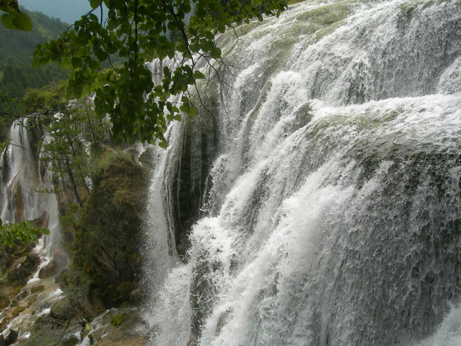 树正群海的上方就是树正瀑布,树正瀑布坐落在树正沟的盆景滩下边,滩上边有无数个像盆景一样的美景,水流就在盆景外沿潺潺流淌,从冬到夏,从春到秋,从早到晚永无止境地流淌,从过去流到现在从没停止。