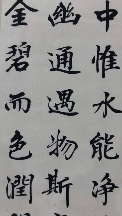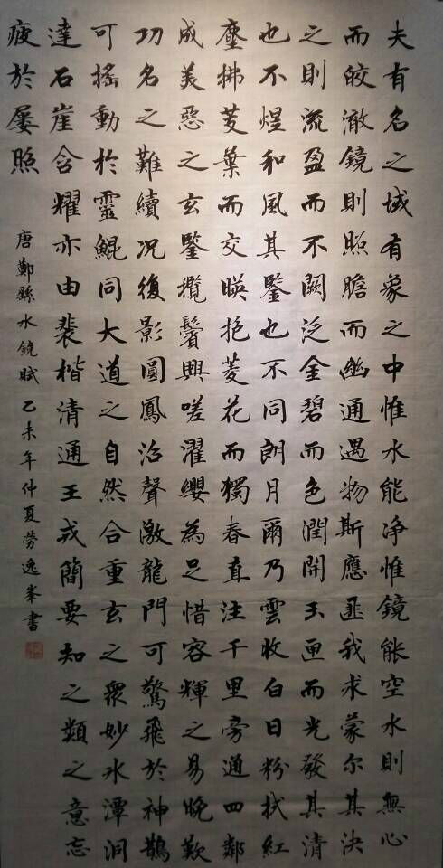劳逸峰同学书写的内容是唐郑繇的《水镜赋》,称颂水与镜的一篇文章,作者以短小精悍的篇幅,告诫人们廉洁为本,廉政为善。