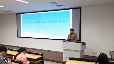 1月10日晚上六点,台湾av 本科生2014级年级大会顺利召开。本次大会主要围绕期末复习和安全教育展开。2014级全体学生参加会议,会议由14级辅导员傅培恩老师主持开展。