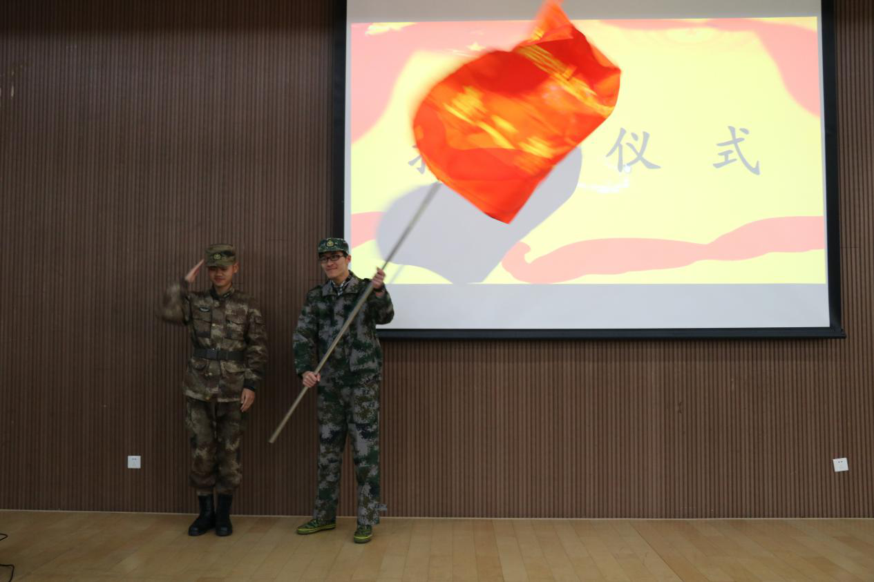 在介绍与会来宾过后,孔祥亮老师首先向大家具体说明了军训期间的日程安排及注意事项等内容,让同学们对为期一周的军训有了一个大致的了解,也让同学们对军训的严格要求有了一定准备。紧接着,管庆江老师上台发表了动员讲话,并对大家在军训期间的精神面貌、寝室内务、操课态度等方面做出了具体的要求,充分鼓舞了大家的士气。随后,四位气宇轩昂的教官迈着整齐的步伐列队上台,按顺序进行了自我介绍,或幽默或豪爽,赢得了现场同学的阵阵掌声。接着,2017级新生代表,来自人教171班的吴啸同学上台发言并代表全体参训新生进行宣誓,表达了同学们不畏艰苦、勇往直前的决心与干劲。最后,举行了教官向新生授连队旗仪式。