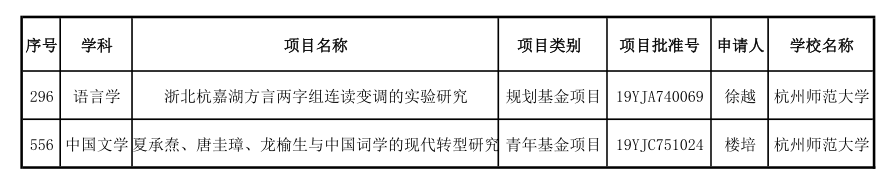 近日,教育部社科司发布了《关于2019年度教育部人文社会科学研究一般项目立项的通知》。在规划基金、青年基金、自筹经费项目的3095项中,我校共有7个课题获准立项,其中我院获立项2项,分别是徐越的《浙北杭嘉湖方言两字组连读变调的实验研究》及楼培的《夏承焘、唐圭璋、龙榆生与中国词学的现代转型研究》。