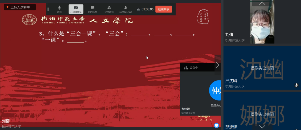 5月24日下午13点,我院“红五月·聚青春”时政知识竞答大赛决赛在钉钉群线上会议平台顺利开展。经过前期初赛的激烈角逐,共有个人组10位同学、团体6组寝室脱颖而出进入决赛。本次决赛分为两轮,个人组和团体组先后完成两轮比拼,分别决出名次。在主持人刘柳同学简短的介绍后,比赛正式开始。