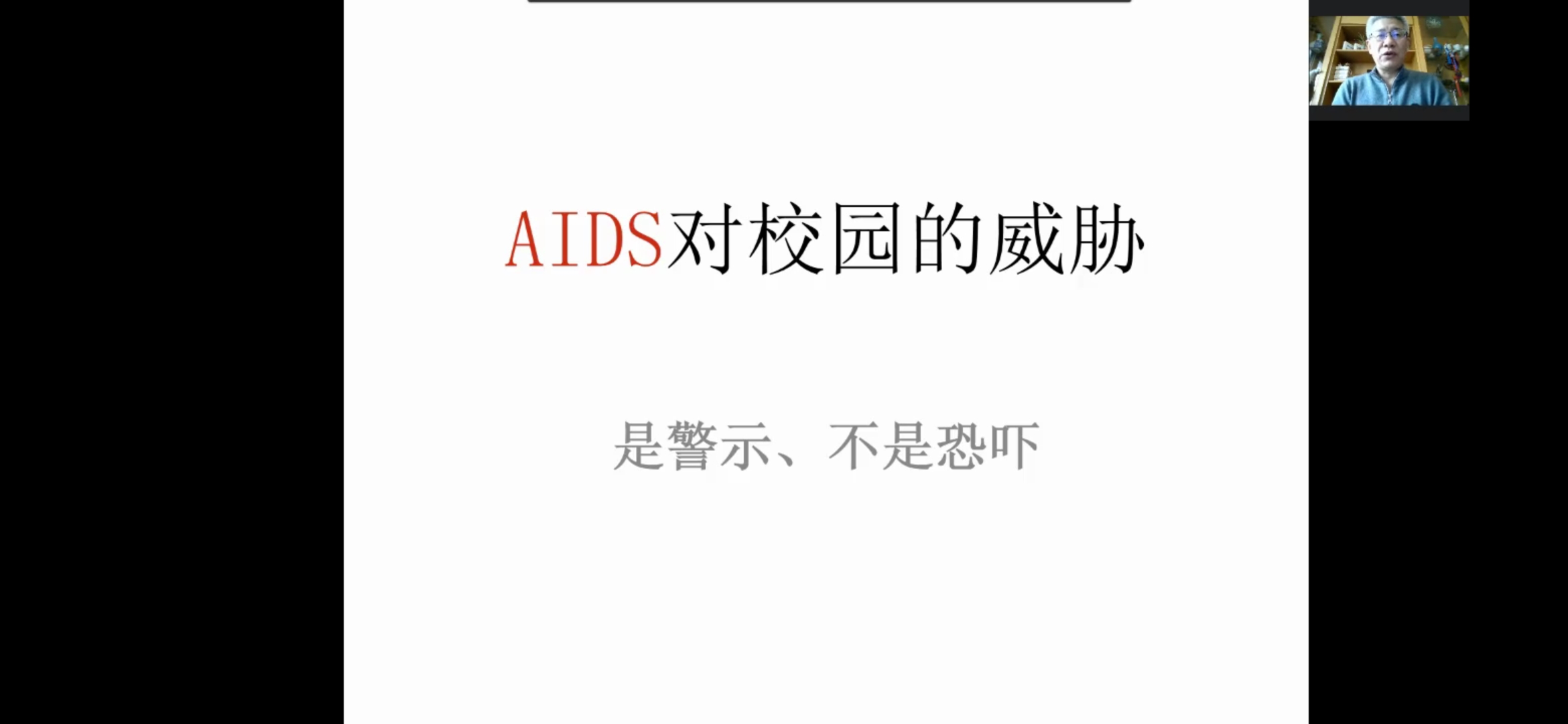讲座最后,刘纯展示了2020年防艾宣传口号“携手防疫抗艾,共担健康责任”,并强调此次讲座目的是警示而非恐吓,学生们应当爱惜自己、远离艾滋。