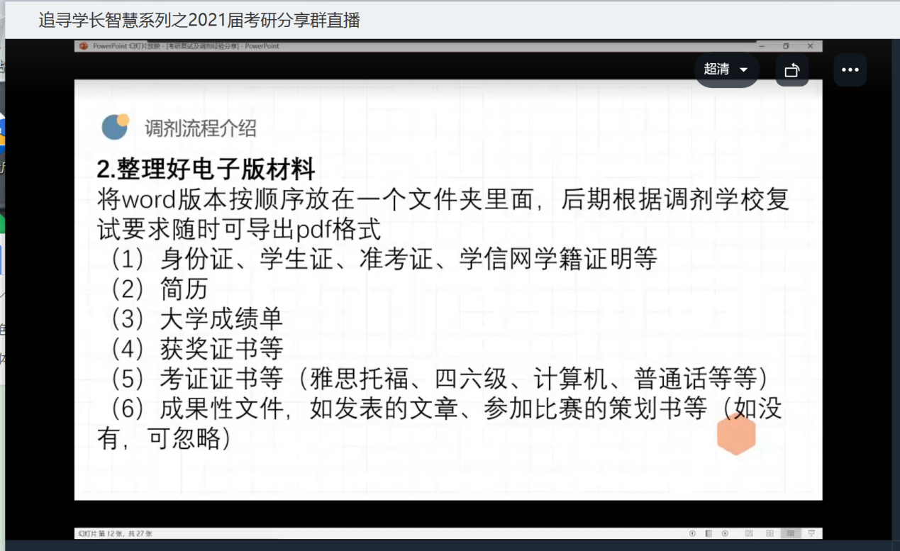 齐敏艳通过自身经历的讲述,明确复试的重要性,从而进入她分享会的主题——“复试准备”。她提到,我们可以从比较报考人数以及了解分数线的相关规定中入手,确定自己是否进入复试。然后,她重点分享了复试前的准备工作和面试时的注意事项。