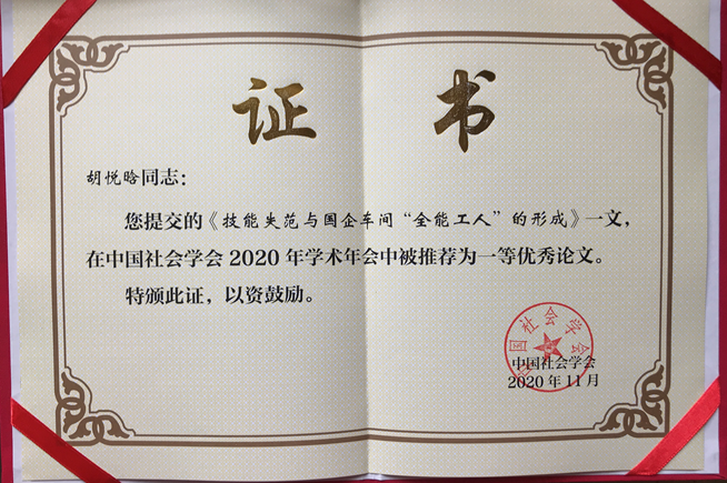 2020年10月31日,中国社会学会2020年学术年会在贵州贵阳花溪大学城召开。我院历史系教师胡悦晗老师的论文《技能失范与国企车间“全能工人”的形成》,从提交中国社会学年会论文2000余篇中脱颖而出,被2020年中国社会学会推荐为一等优秀论文。