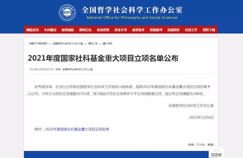 2021年12月6日,全国社科规划办公布了2021年度国家社科基金重大项目立项名单。我院邵宁宁教授担任首席专家的项目《中国现当代文学思潮中的古典传统重释重构及其互动关系史研究》(21&ZD267)获得国家社科基金重大项目的立项,张兴武教授担任首席专家申报的《经史之学与古典文学的关联及互动研究》(21AZD133)、杨向荣教授担任首席专家申报的《齐美尔美学艺术学思想文献整理与研究》(21AZD106)获批为重点项目。