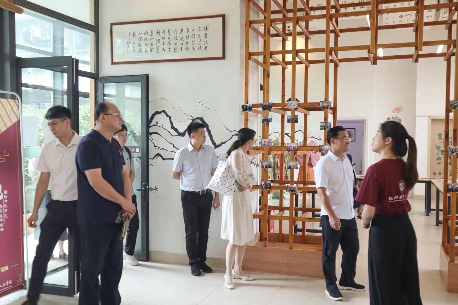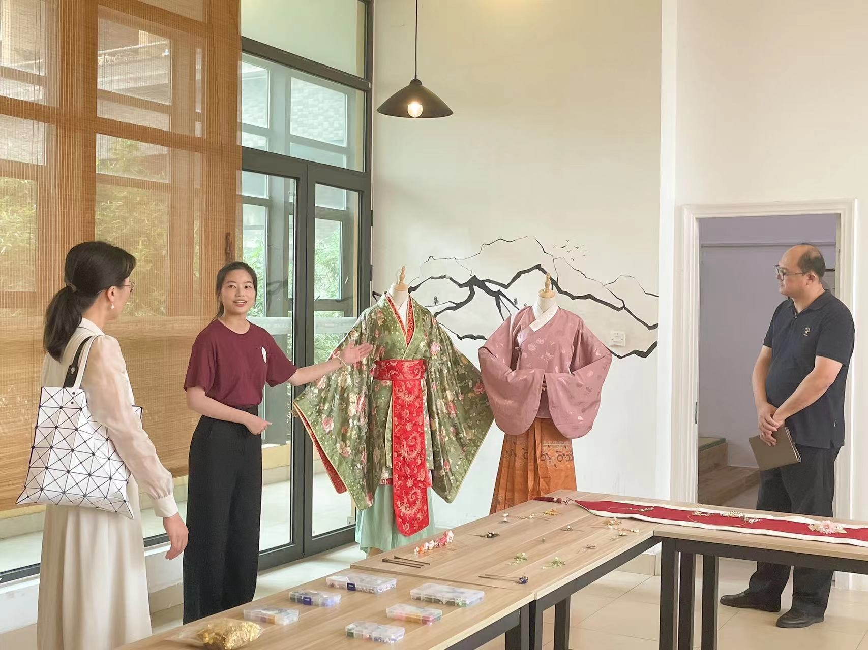 随后,学生负责人陈佳滢向领导们介绍了以泽地书院为阵地开展活动的三大特色社团。嘉礼华服社着重通过研究古代服饰、制作古代首饰,深入学习中华传统礼仪和文化内涵。繁星文讯社日常开展文史读书会等大型文学阅读活动;麓溪书画社历史悠久,文化韵味十足,定期在泽地书院开展书画联系和书画展览。现场还展示了华服社日常研究的首饰、弓箭和不同朝代华服,书画社成员现场进行了书法创作。