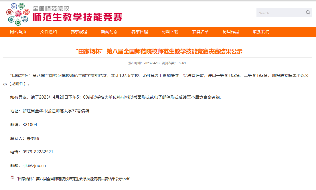 近日,“田家炳杯”第八届全国师范院校师范生教学技能竞赛在浙江师范大学圆满落幕。来自全国107所学校的、294名选手参加决赛,我院学生在本次竞赛中取得佳绩。