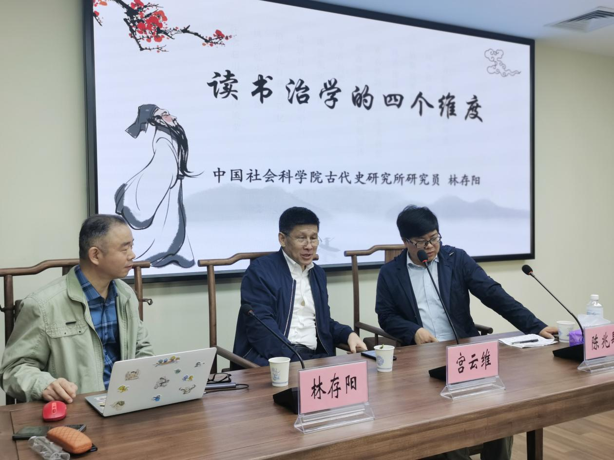 太炎讲堂系列讲座在恕园23号楼314会议室召开,中国社会科学院古代史研究所研究员、博士生导师林存阳老师受邀作题为“读书治学的四个维度”的报告,历史系陈兆肆教授担任主持人,浙江工商大学历史系教授宫云维教授参会与谈。我院历史系琚小飞副教授、蔡丹妮老师一同出席报告。众多师生齐聚一堂,共同聆听了这场学术盛宴。