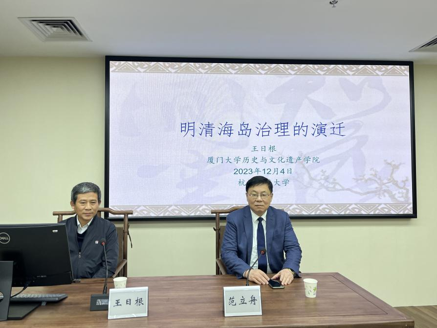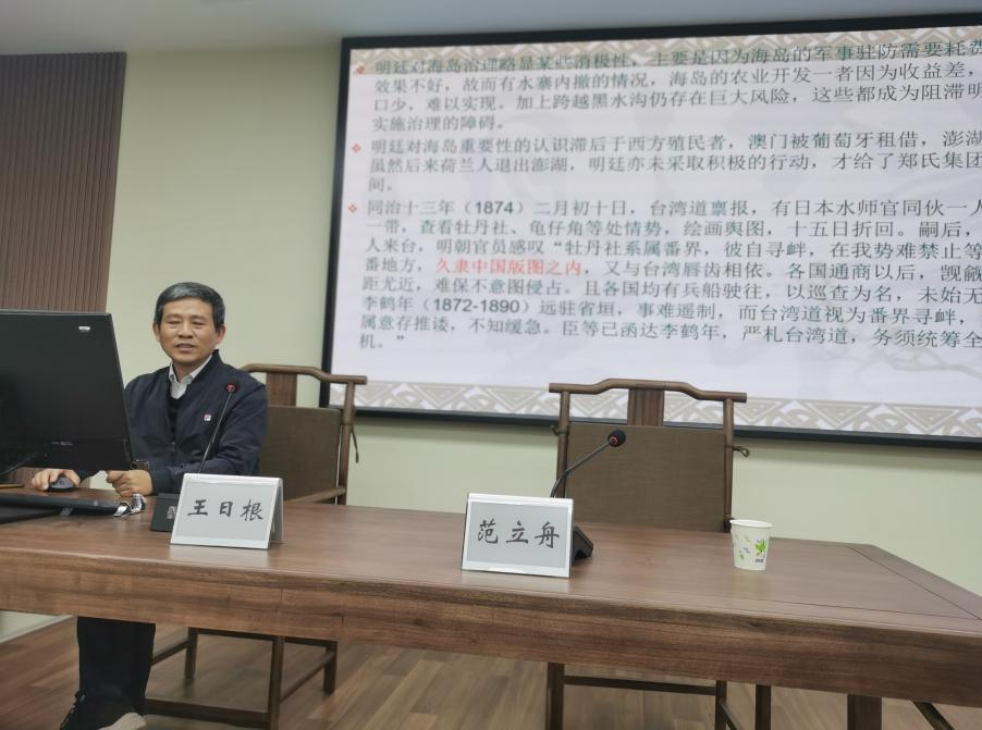 2023年12月4日下午,台湾av 太炎讲堂系列讲座在恕园23号楼314会议室召开,厦门大学历史与文化遗产学院教授王日根老师受邀作题为“明清海岛治理的演迁”的报告,历史系范立舟教授担任主持人。历史系周东华教授、余清良副教授、尤东进副教授、琚小飞副教授、蔡丹妮博士等参会与谈。众多师生齐聚一堂,共飨学术盛宴。