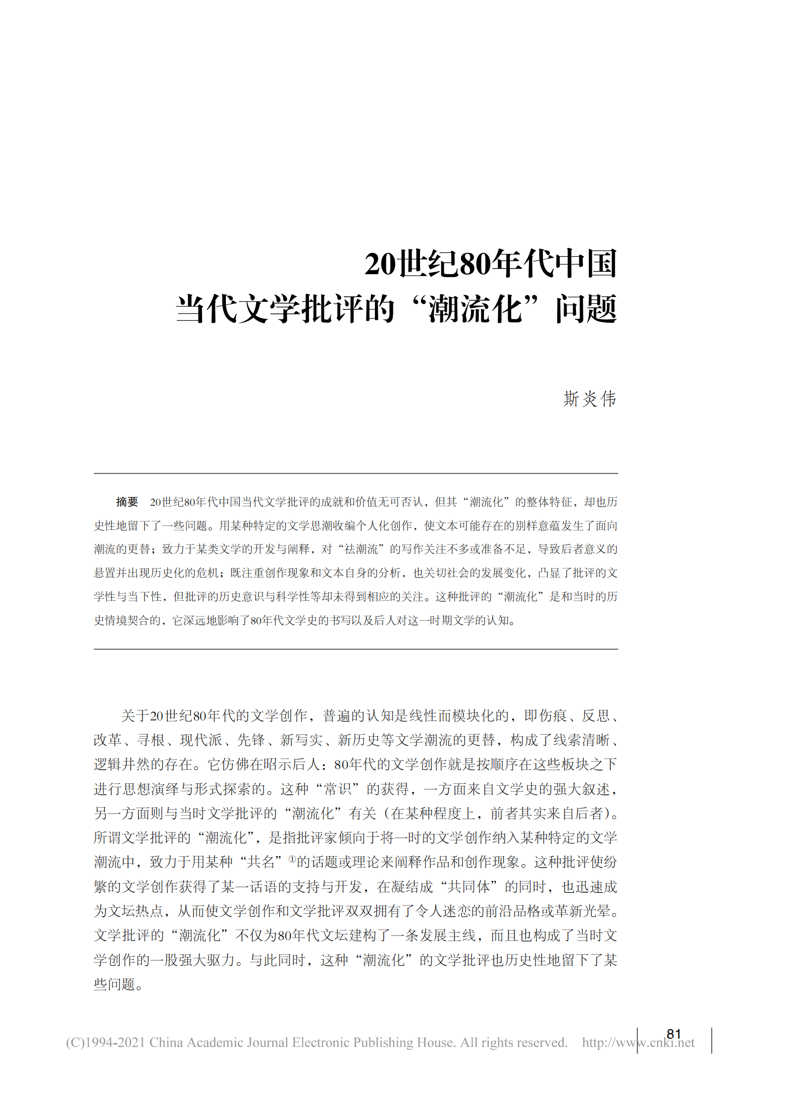 斯炎伟教授撰写的论文《20世纪80年代中国当代文学批评的“潮流化”问题》发表于《文艺研究》2021年第10期,《新华文摘》2022年第10期全文转载,《中国社会科学文摘》2022年第3期全文转摘,《人大复印报刊资料·文艺理论》2022年第2期全文转载,《社会科学文摘》2021年第11期全文转摘,《中国文学研究文摘》2021年第二辑全文转摘,“中国作家网”2021年11月30日全文转载,“中国散文网”2021年12月1日全文转载。该论文探讨20世纪80年代中国当代文学批评"潮流化"的整体特征及留下的一系列问题。用某种特定的文学思潮收编个人化创作,使文本可能存在的别样意蕴发生了面向潮流的更替;致力于某类文学的开发与阐释,对"祛潮流"的写作关注不多或准备不足,导致后者意义的悬置并出现历史化的危机;既注重创作现象和文本自身的分析,也关切社会的发展变化,凸显了批评的文学性与当下性,但批评的历史意识与科学性等却未得到相应的关注。这种批评的"潮流化"是和当时的历史情境契合的,它深远地影响了80年代文学史的书写以及后人对这一时期文学的认知。