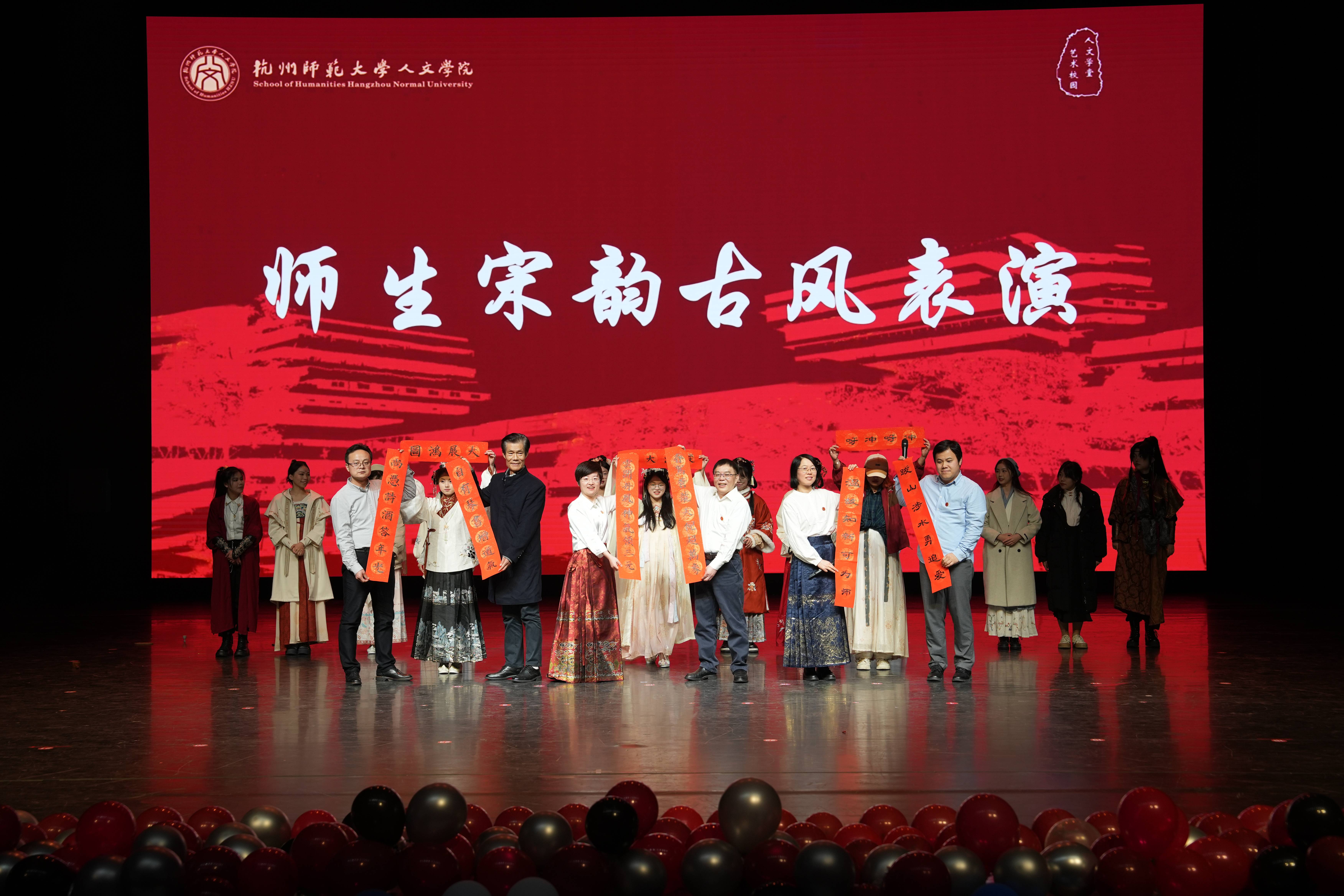 在表彰大会上,师生同台互动表演。资深教授沈松勤携手院领导班子演绎朗诵,校五星级社团嘉礼华服社的汉服走秀大放光彩。学院参与亚运的老师与学生代表合唱《同爱同在》,共同回忆亚运精彩瞬间。预科班全体成员带来独具特色的新疆歌舞表演,拉动了现场表彰气氛。陈漪、王海晗与学生共同表演话剧《两只狗的生活意见》,以此表达年轻一代对生活的理解。